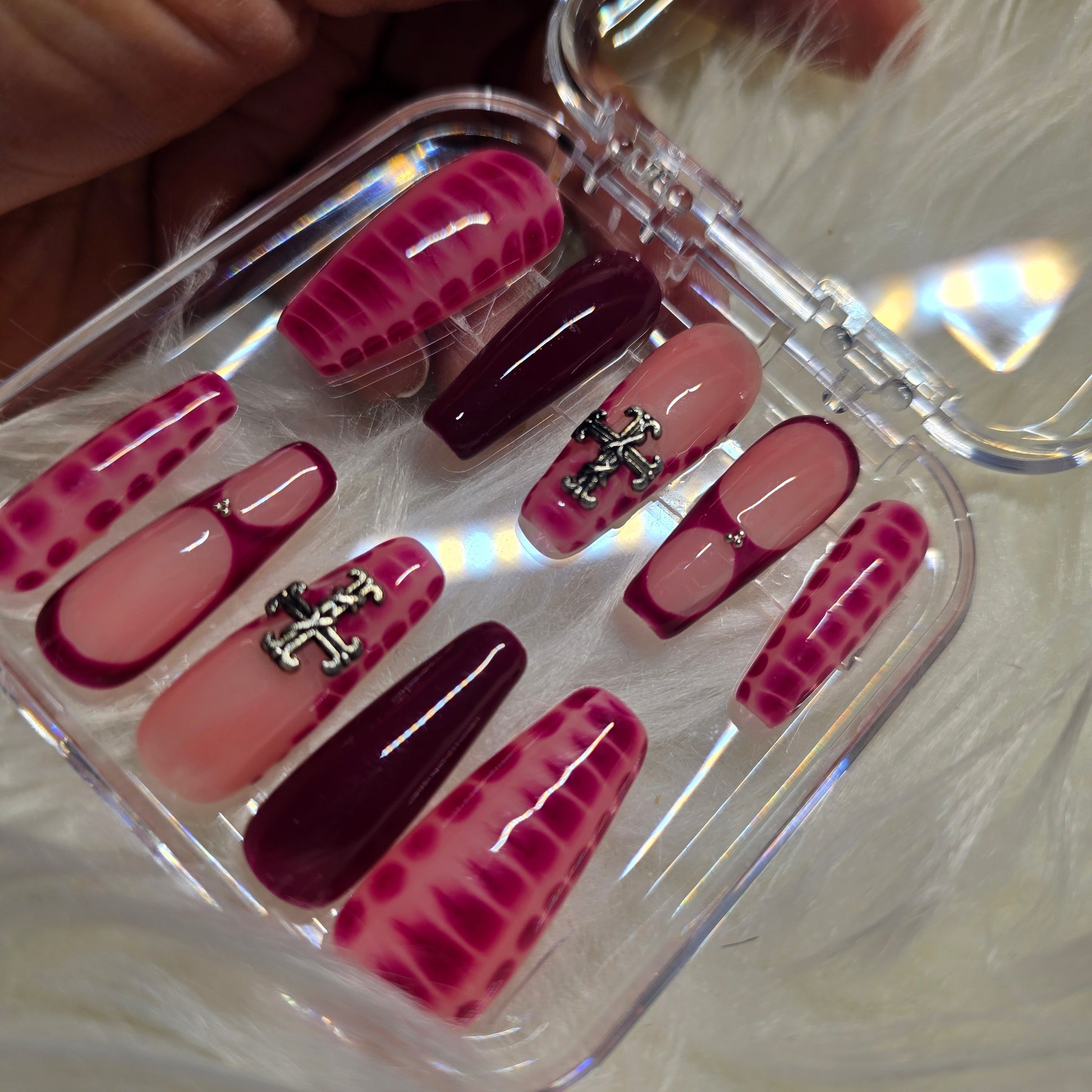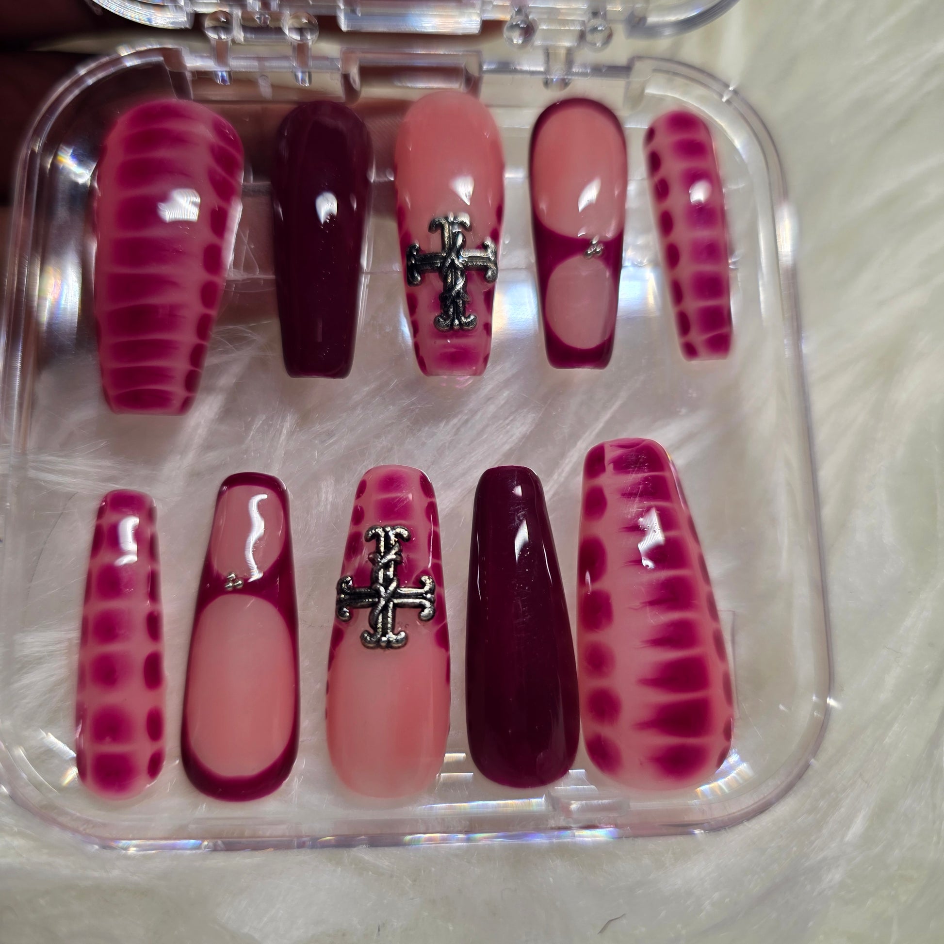 Upgrade your style with our Custom Press On nails. Our Burgundy nails come adorned with a charming cross design that's both elegant and trendy. With our blooming design, you'll make a statement wherever you go. Perfect for any occasion, these press ons give you the freedom to express yourself.