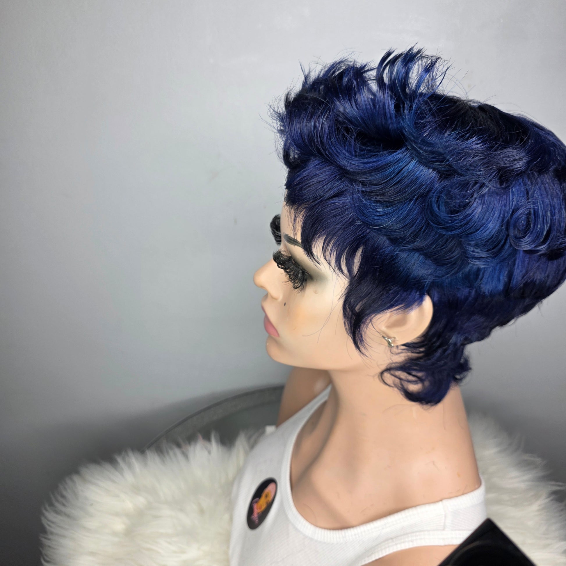 Turn heads and own every room with the Midnight Muse Pixie — a bold, electric-blue masterpiece that blends edgy flair with timeless elegance. This short, sculpted style features soft waves and feathered layers that frame the face beautifully, creating a captivating, high-fashion look. Perfect for the confident woman who dares to be different, this unit delivers effortless glam with a touch of mystery.